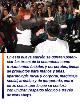 En esta nueva edición se quieren potenciar las áreas de la cosmética como tratamientos faciales y corporales, líneas de productos para manos y uñas, aparatología facial y corporal, maquillaje social, artístico y de temporada, entre otras cosas, por lo que se contará con un gran respaldo técnico a través de workshops.