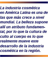 El culto al cuerpo está llevando a la industria de la cosmética a obtener unos ingresos anuales de 80.000 millones de dólares, con perspectivas de seguir aumentando, lo que sitúa a Latinoamérica en tercer lugar a nivel mundial