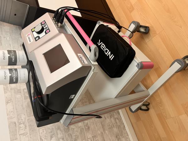 Se vende Indiba ER 45 en perfectas condiciones, con carro portátil, todos los accesorios, placa de retorno , mango CAP y mando RES, set completo de cabezales RES y CAP!