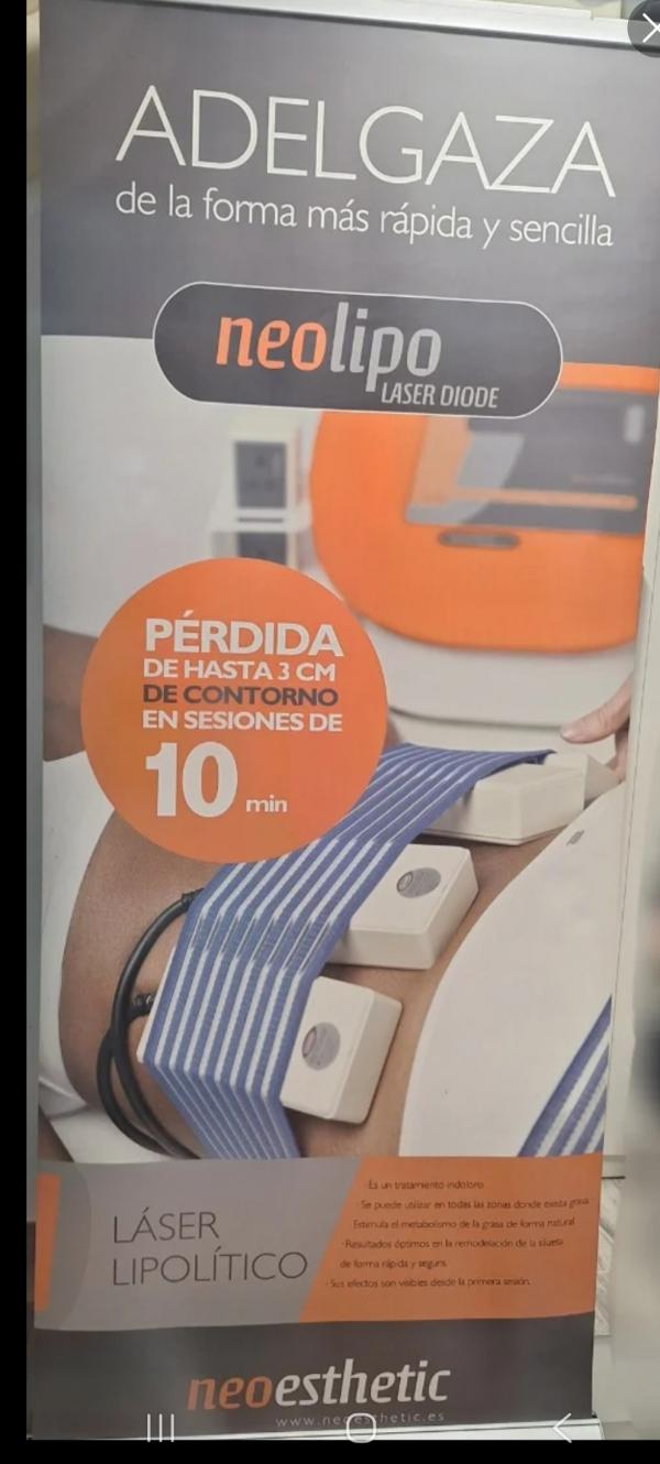 Se vende dispositivo de laserlipólisis Neolipo. Tratamiento indoloro, estimula el metabolismo de la grasa de forma natural. Resultados visibles desde la primera sesión. Se incluye flyers y Roll up de 2,15m de alto para escaparate.