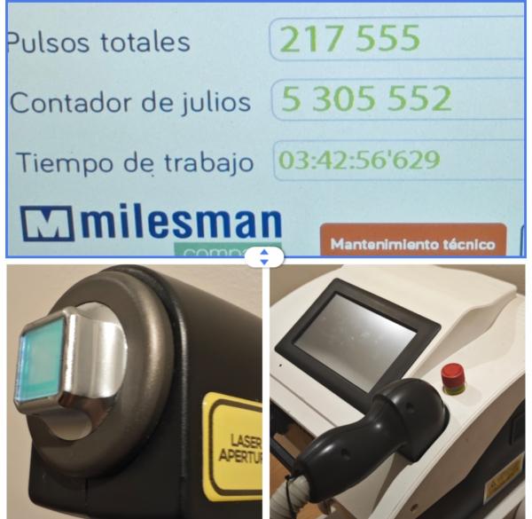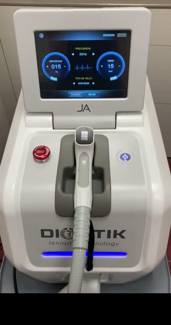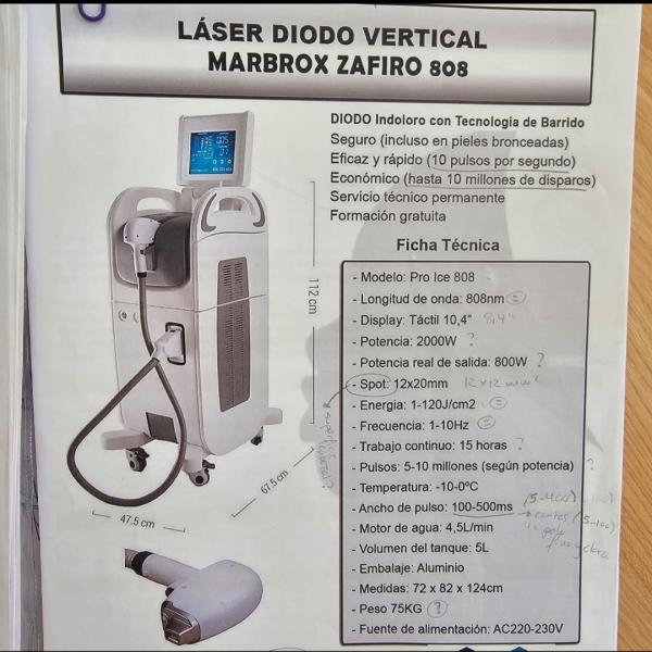 Se vende láser de Diodo de segunda mano con todas las revisiones anuales pasadas. 1200W, pantalla táctil muy intuitiva, manípulo ergonómico, doble refrigeración hasta -20°C. Comprada nueva en 2022. Se vende por cierre de negocio.