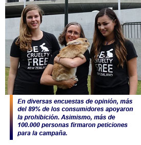 La Human Society International, a través de la campaña #BeCrueltyFree, colaboró con Green MP Mojo Mathers, partido ecologista neozelandés, para que se decrete una enmienda a la Ley de Bienestar Animal que impida los ensayos en la industria cosmética. Así pues, desde el pasado 4 de abril, y una vez revisada y corregida dicha Ley, los ensayos en animales para productos cosméticos e ingredientes terminados, destinados exclusivamente a uso cosmético, serán ilegales en Nueva Zelanda.