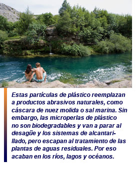 Las microperlas de plástico se emplean en cosmética y productos de cuidado personal -mascarillas faciales exfoliantes, jabones líquidos corporales, jabones para las manos y pasta de dientes- debido a sus propiedades exfoliantes. Estas partículas de plástico reemplazan a productos abrasivos naturales, como cáscara de nuez molida o sal marina. Sin embargo, las microperlas de plástico no son biodegradables. Estas partículas van a parar al desagüe y los sistemas de alcantarillado, pero escapan al tratamiento de las plantas de aguas residuales. Por eso acaban en los ríos, lagos y océanos. Allí permanecen durante siglos, acumulando sustancias tóxicas sobre la superficie marina. Su presencia en estos hábitats amenaza a las especies autóctonas y también a la salud pública de los seres humanos.