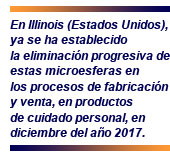 legislación contraria al uso de microperlas de plástico en cosméticos Fuentes de Personal Care Products Council recalcaron la urgencia de desarrollar políticas, por parte de todas las empresas y negocios de la comunidad, que contribuyeran a eliminar los residuos plásticos en canales y ríos. Soluciones -insistieron- efectivas y reales bajo el auspicio de expertos científicos. Así pues, ya se ha establecido la eliminación progresiva de estas microesferas en los procesos de fabricación y venta, en productos de cuidado personal, en diciembre del año 2017. Así se especifica en la legislación del estado de Illinois, con el apoyo de las entidades americanas mencionadas.