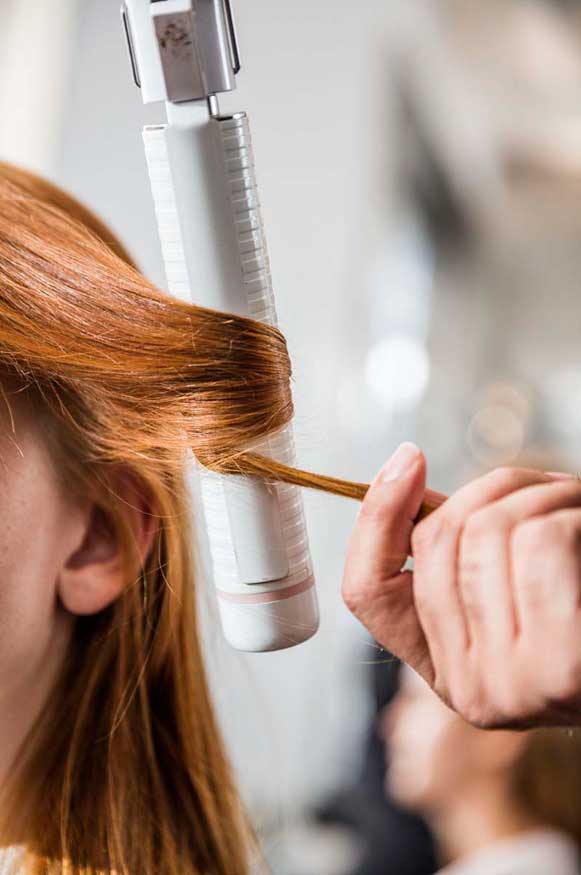 - Una vez que el cabello esté seco, envolver mecha a mecha alrededor de un rizador.