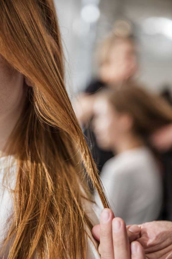 Antonieta Beenders, directora creativa a nivel mundial de Aveda, añadió un toque de locura a los peinados de los modelos del desfile de Stella McCartney durante la presentación de la colección Pre-Fall a principios de 2016.