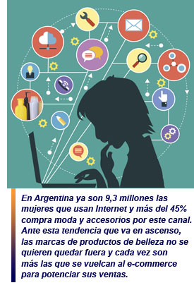 En Argentina ya son 9,3 millones las mujeres que usan Internet y más del 45% compra moda y accesorios por este canal. Ante esta tendencia que va en ascenso, las marcas de productos de belleza no se quieren quedar fuera y cada vez son más las que se vuelcan al e-commerce para potenciar sus ventas. Según informan desde MercadoLibre, el sitio de e-commerce líder en Latinoamérica, se venden 28.000 productos de belleza por mes, un 20% más que hace un año.