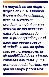 La mayoría de las mujeres negras de EE UU todavía llevan peinados alisados, pero ha surgido un creciente movimiento en defensa de los peinados naturales, alimentado por la preocupación por el daño que puede causar al cabello el uso de químicos, un incremento en la disponibilidad de productos capilares naturales y una gran comunidad en Internet que da apoyo y consejos.