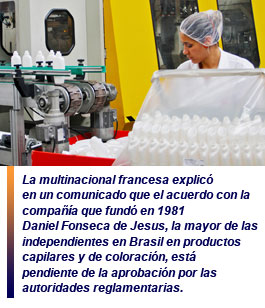 L'Oréal sigue de compras y continúa engordando su cartera de activos, sobre todo en mercados emergentes. La multinacional francesa explicó en un comunicado que el acuerdo con la compañía que fundó en 1981 Daniel Fonseca de Jesus, la mayor de las independientes en Brasil en productos capilares y de coloración, está pendiente de la aprobación por las autoridades reglamentarias.