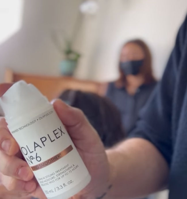 A continuación, aplicó una cantidad generosa de Bruma Voluminizadora en las raíces, seguida de cinco gotas de Olaplex Nº.7 Bonding Oil en las puntas y los medios, y una bomba de Olaplex Nº.9 Bond Protector Nourishing Hair Serum para una mayor protección contra el calor.