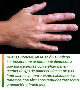 - Se presentó un estudio que demuestra que los pacientes con vitíligo tienen menos riesgo de padecer cáncer de piel. Interesante, ya que a estos pacientes les tratamos con fármacos inmunosupresores y radiación ultravioleta.