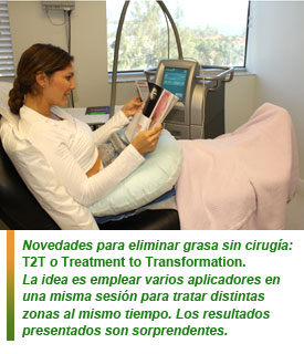 ➔ Novedades para eliminar grasa sin cirugía: T2T o Treatment to Transformation. La idea es emplear varios aplicadores en una misma sesión para tratar distintas zonas al mismo tiempo. Los resultados presentados son sorprendentes. Empiezan a surgir clínicas en EE UU en las que solo se realiza este tratamiento: http://www.coolslim.com/the-center-of-excellence.html.