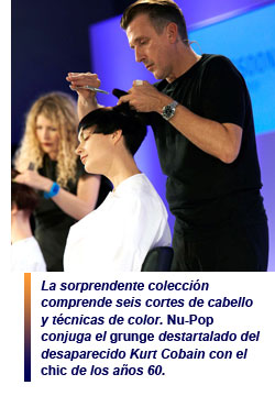 La sorprendente colección comprende seis cortes de cabello y técnicas de color. Nu-Pop conjuga el grunge destartalado del desaparecido Kurt Cobain con el chic de los años 60 -cortes cuadrados, triangulares y geométricos- de la supermodelo Peggy Moffit.