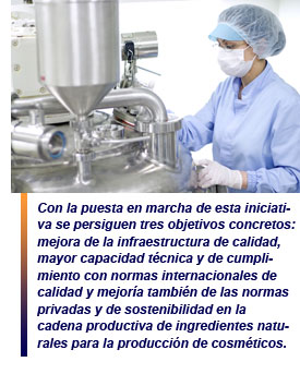 El acuerdo, cuya inversión será de 2,7 millones de dólares, denominado Programa de calidad para el sector de cosméticos en Colombia, brinda un primer apoyo a la cadena productiva del sector cosméticos en aras de una mayor incorporación de ingredientes naturales. Con la puesta en marcha de esta iniciativa se persiguen tres objetivos concretos: mejora de la infraestructura de calidad, mayor capacidad técnica y de cumplimiento con normas internacionales de calidad y mejoría también de las normas privadas y de sostenibilidad en la cadena productiva de ingredientes naturales para la producción de cosméticos. El programa se llevará a cabo durante el cuatrienio 2014-2018.